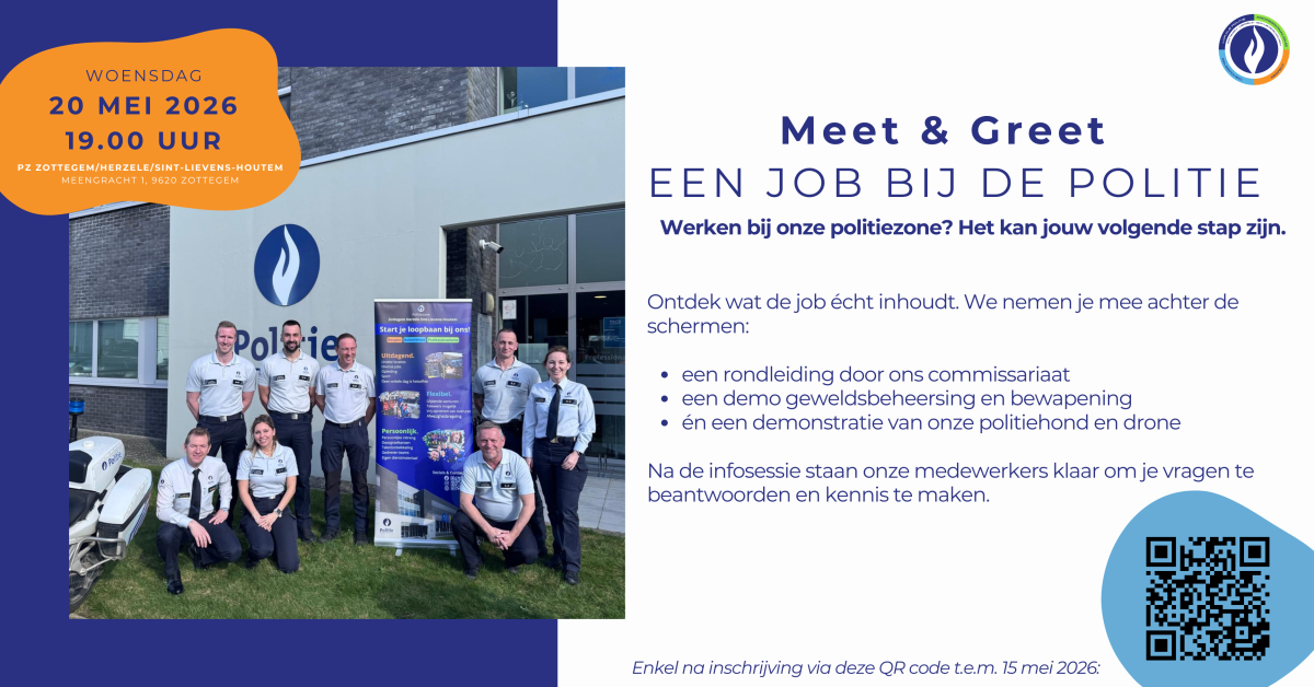 Benieuwd hoe het is om bij de politie te werken? Tijdens onze Meet & Greet op woensdag 20 mei 2026 krijg je een unieke blik achter de schermen van PZ Zottegem/Herzele/Sint-Lievens-Houtem en ontdek je de veelzijdigheid van het politiewerk, van praktijkdemonstraties tot persoonlijke gesprekken met onze collega's.
